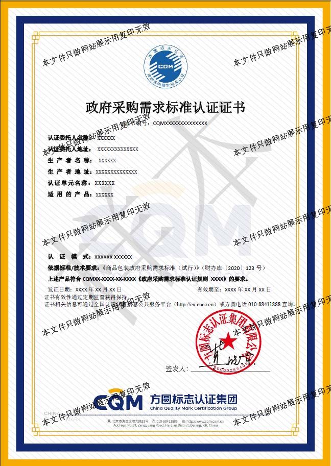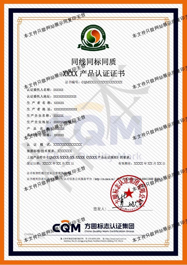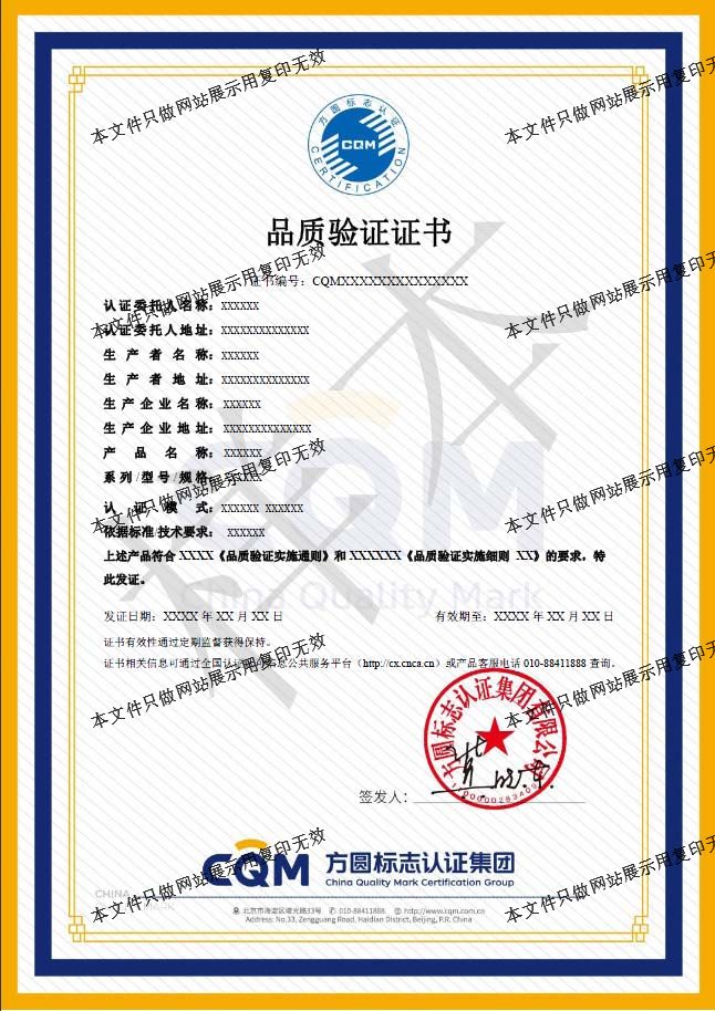 為加強(qiáng)對方圓自愿性產(chǎn)品認(rèn)證標(biāo)志的管理,確保產(chǎn)品認(rèn)證標(biāo)志的正確使用,維護(hù)產(chǎn)品認(rèn)證標(biāo)志的權(quán)威性和CQM的信譽(yù),方圓標(biāo)志認(rèn)證集團(tuán)依據(jù)國家認(rèn)證認(rèn)可的相關(guān)要求制定了產(chǎn)品認(rèn)證標(biāo)志使用規(guī)范。標(biāo)志基本樣式: